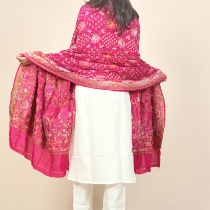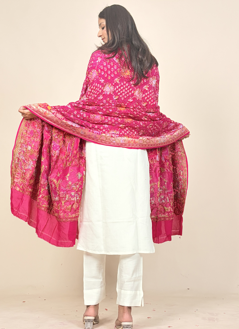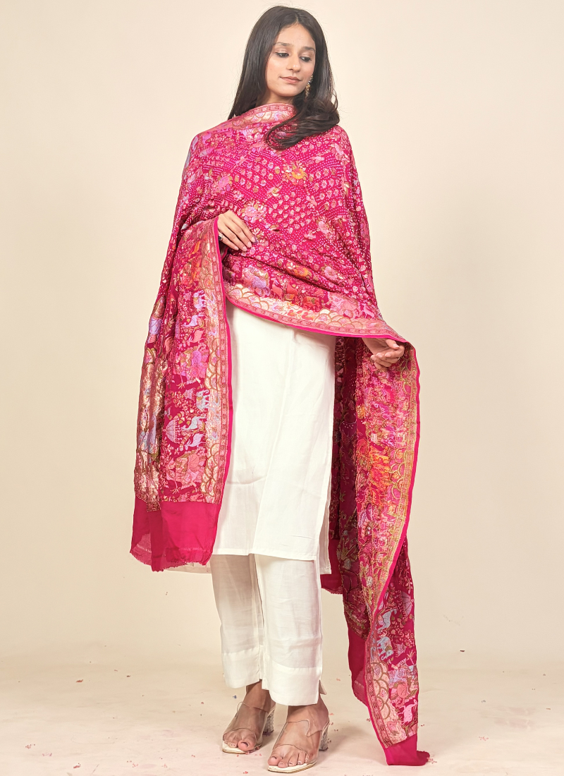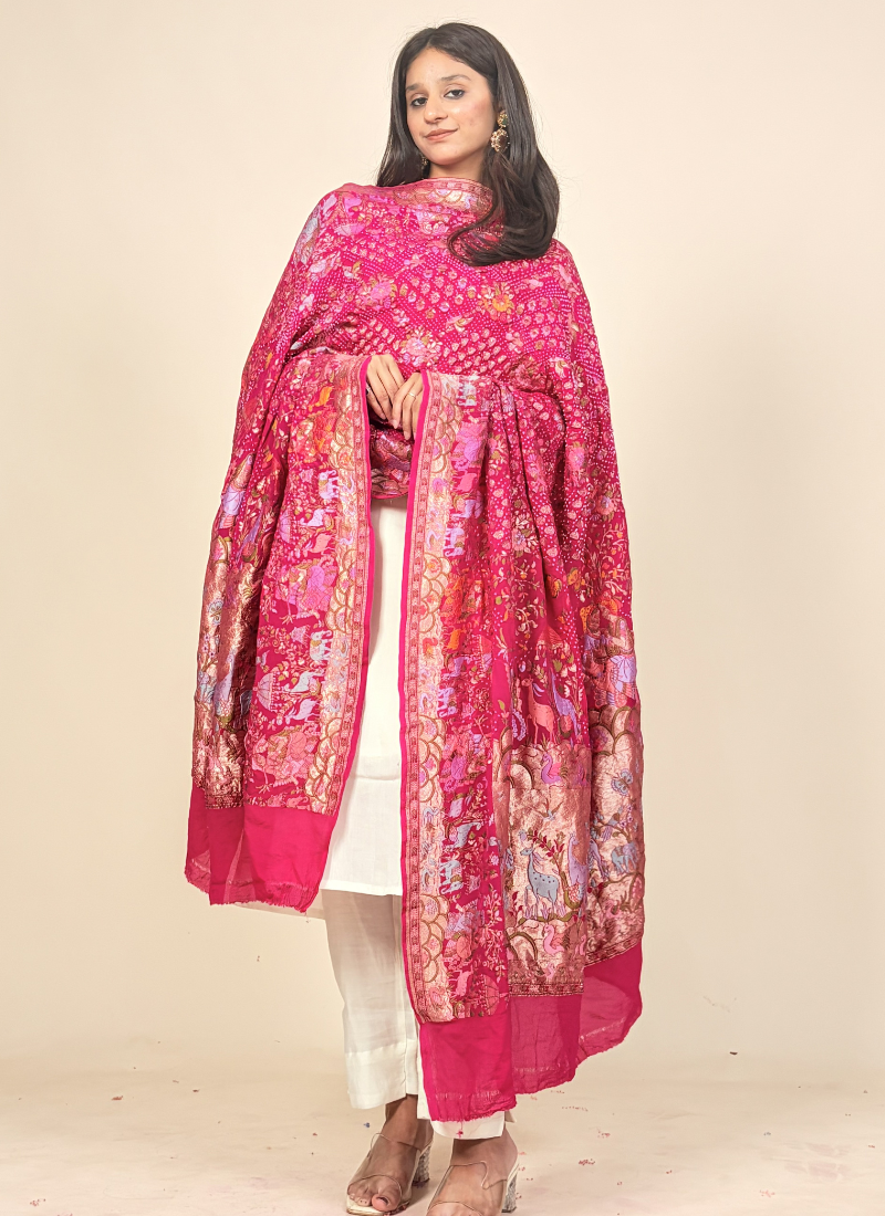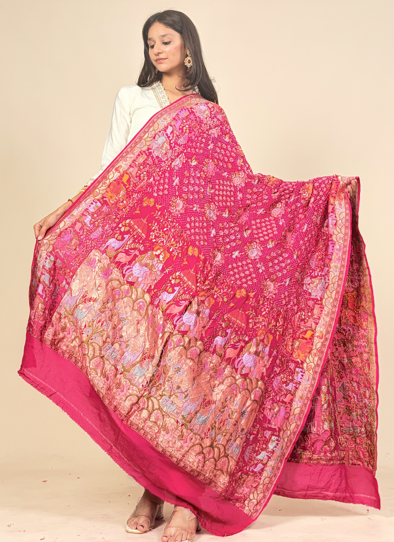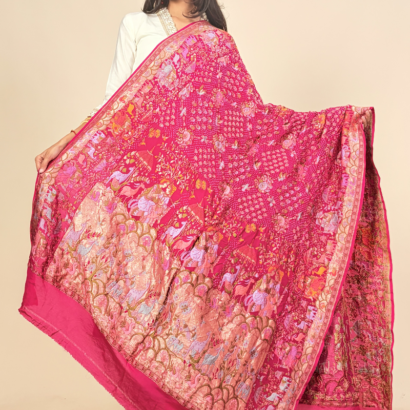 This dupatta is a luxurious, heritage-inspired statement piece in a vibrant rani pink hue, beautifully adorned with intricate artistic detailing.